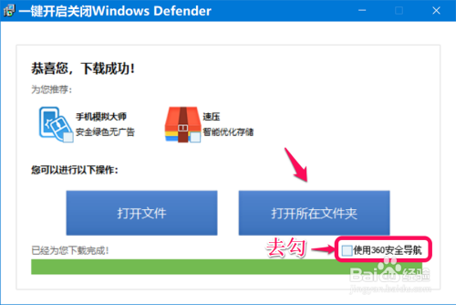 下载完当作今后,我们在保留下载文件的磁盘中找到并左键双击:一键开启封闭Windows Defender 图标;
