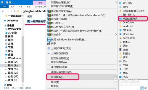解压完当作今后,我们找到并右键点击:一键开启封闭Windows Defender文件,在右键菜单中点击【发送到】 - 【桌面快捷体例】;