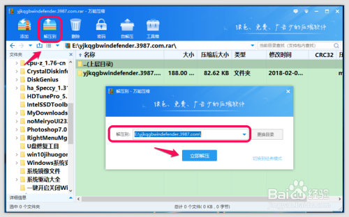 在打开的解压压缩文件窗口中,点击【解压到】,确定好解压后文件的保留路径后,点击:当即解压;