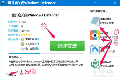 在 一键开启封闭Windows Defender 窗口中,① 按图所示点击去勾;② 点击快速安装(现实是下载文件);