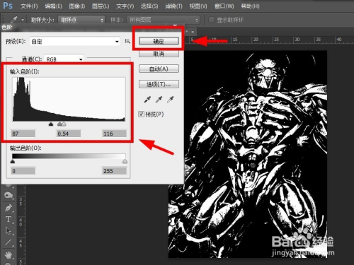 在“色阶窗口/输超卓阶”(小编的数值为87/0.54/116),调整到图片当作为纯口角两色对立结果,然后点击“确定”