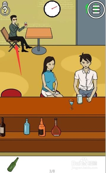 这个总共就一个画面,首选第一步也是不雅察,看见除了男女本家儿角还有一个茶青色衣服的帅哥,本家儿角桌下还有一个绿色瓶子的酒。