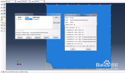 之后进入load模块进行鸿沟前提的设置,如图所示约束住模子的上边缘的所有自由度
