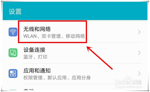 在设置页面,找到“无线和收集”选项,可看到该选项中,可以对“WLAN、双卡办理、移动收集”等进行设置,点击进入。