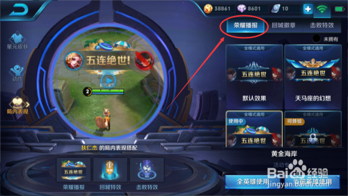 尔后,我们就会看到熟悉的荣耀播报局内表示页面,我们可以查看或者设置到本身拥有和未拥有的荣耀播报特效 。