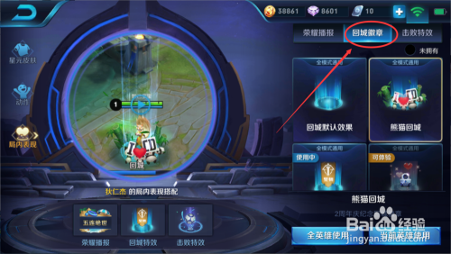 我们也可以在上方点击“回城徽章 ”和“击败特效 ”这两个按钮,打开查看到王者荣耀的回城特效和击败特效 。