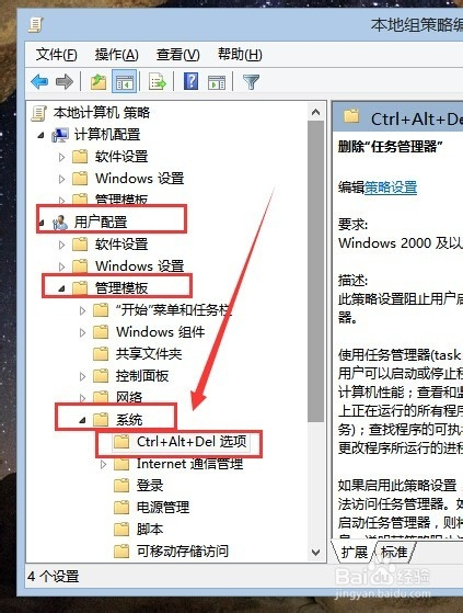 如许,我们便打开了Windows操作系统的组策略功能,接下来,我们双击打开用户设置装备摆设-办理模板-系统这三级菜单。