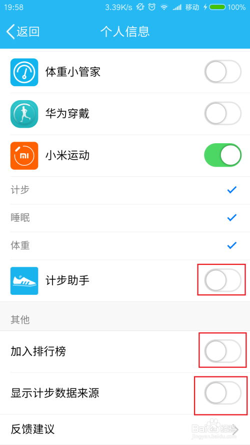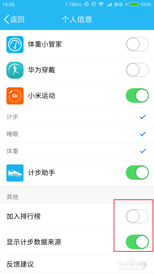 除了点击开启计步助手功能之外,我们还可以点击开启步数排行榜,同时注重开启显示步数的来历功能。