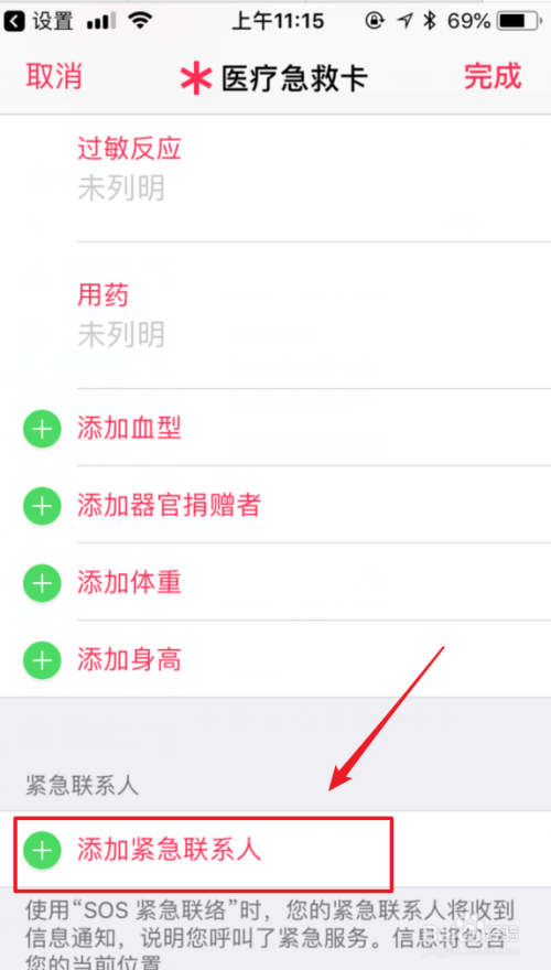 添加完毕后,下滑页面底部,选择添加告急联络人。