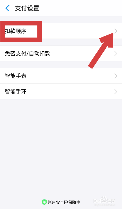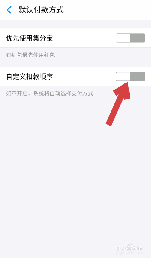 进入付出设置页面点击第一行“扣条目挨次”后边的“>”进入“默认付条目体例”页面。