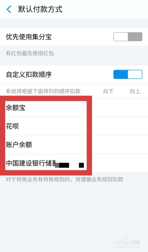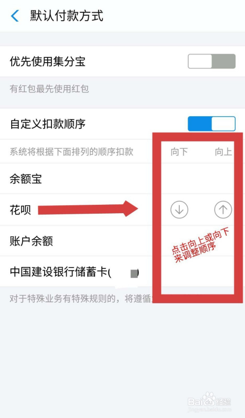 在默认付条目体例页面,点击“自界说扣条目挨次”后边的开关,待开关变为蓝色,页面会呈现余额宝、花呗、账户余额、银行卡四种付出体例,点击肆意某个付出体例的后方会呈现带有标的目的上、标的目的下标记的小圆圈,点击标的目的上对应的付出体例标的目的上移一行,点击标的目的下该付出体例挨次标的目的下移一行。我们可以按照本身的需要调整付出体例的挨次。