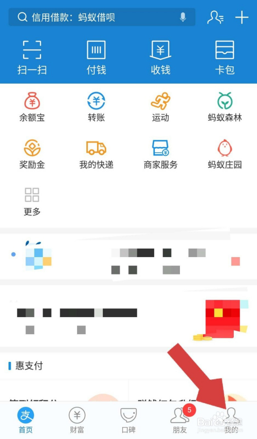 打开手机付出宝,进入付出宝首页,点击页面下方的“我的”,进入我的页面。