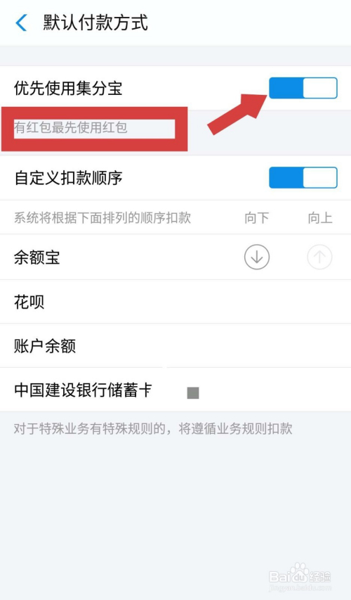 眼尖的伴侣就会发现,在默认体例页面还有一项叫“优先利用集分宝”,下边的小字“有红包最先利用红包”,这里我们也要把后边的开关打开为蓝色,如许付出时若是有红包就可以抵扣了。