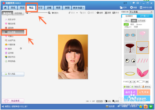 用鼠标拖拽蓝色的框可以调节饰品的大小、倾斜度和透明度,让你随心所欲地阐扬想像力~右下角的”对比“键让你可以更直不雅地看到美图当作果~