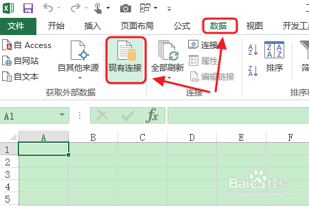 在空白工作簿的左下角sheet 1工作表傍边,我们随意选择一个空白单位格,接着点击“数据”-“现有毗连”;
