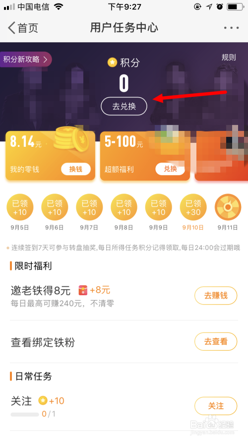 OK,积分兑换完了。若是想要提现的话,就要点击 去兑换 。