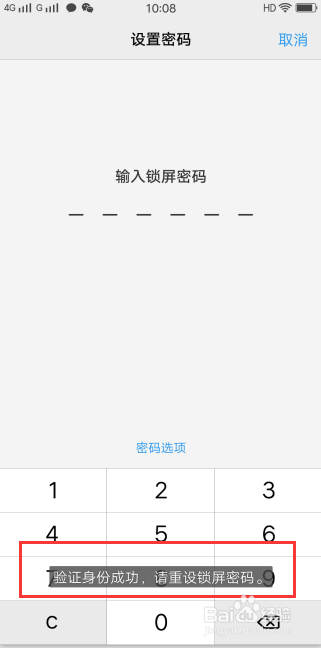 若是验证谜底精确,底部会提醒验证身份当作功,请重设锁屏密码的提醒。