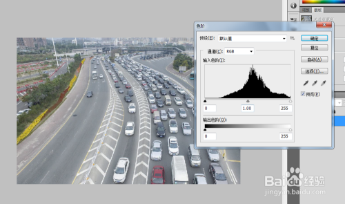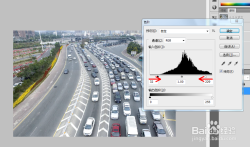 按住键盘“Ctrl+L”,弹出色阶对话框,按图示剪头偏向做恰当的调节;