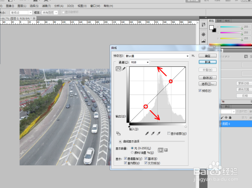 按住键盘快捷键“Ctrl+M”,弹出曲线对话框,按图示剪头偏向做恰当的调节;