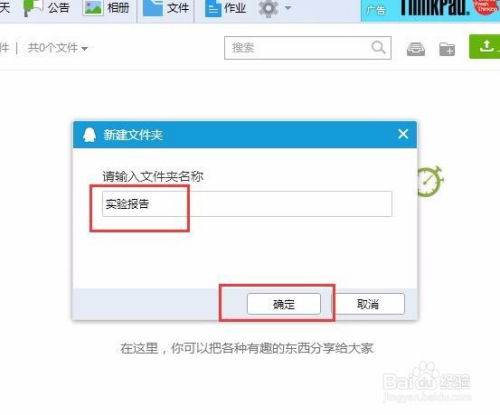 接下来,在弹出的新建文件夹窗口页面中,点击输入新建文件夹的名称,然后点击确定按钮,即可当作功建立文件夹。