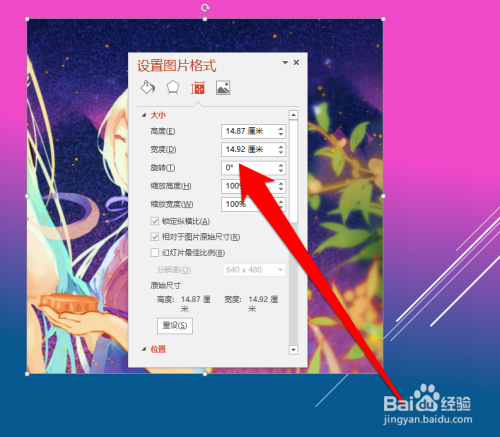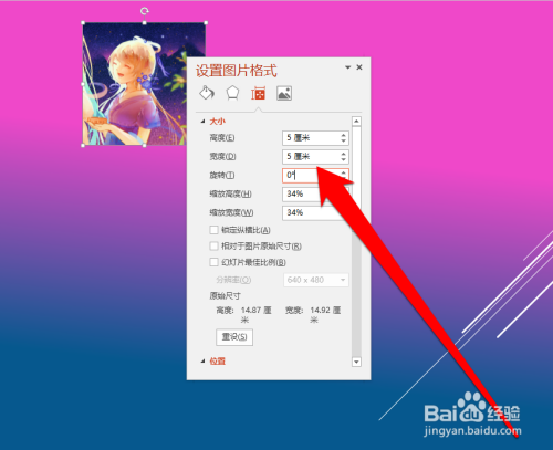选中图片后,右键选择大小和位置。