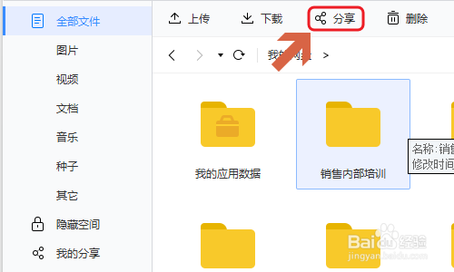 那么如何将网盘里的某个文件或者文件夹共享给他人呢?其实很简单,我们首先选中文件或者文件夹,如图所示...然后页面的上方能看到一个“分享”选项;