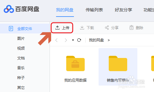 打开网盘首页,我们就会在首页的左上角看到“上传”两个字,点击今后可以上传文件以及文件夹;