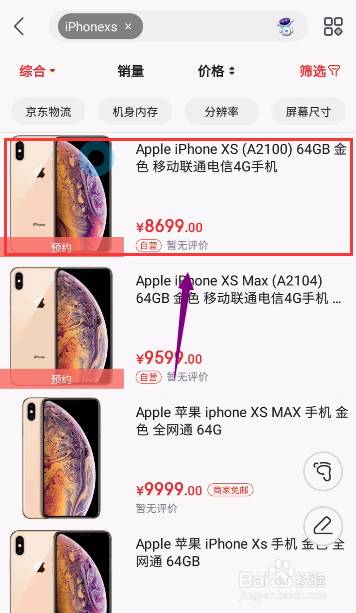 返回顾页搜刮iPhoneXS,点击搜刮成果的自营,有3个容量版本,如下图所示