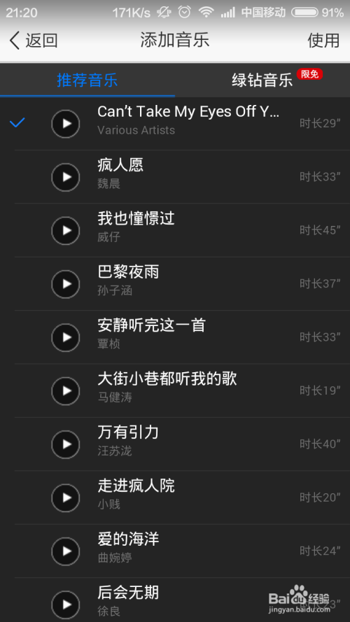 在添加音乐时,我们首先会进入音乐库,在音乐库中我们可以直接点击选择保举的音乐,将其添加到动感影集中,若是你是绿钻用户,还可以选择利用绿钻用户专用音乐,我们点击此中喜好的音乐,即可添加当作功。