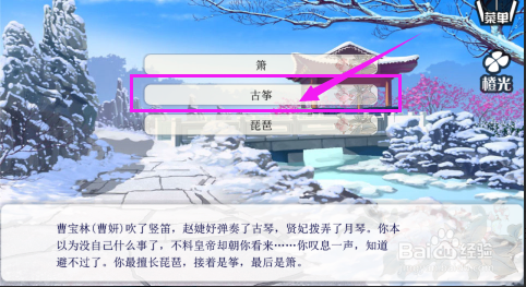 乐器可以选择古筝或是箫。若是选择琵琶,会因为太超卓,获咎贤妃,直接进入灭亡!古筝是第二擅长的,建议选择古筝。归正选箫也一样,都是让被比下去的人对你的好感为负数。