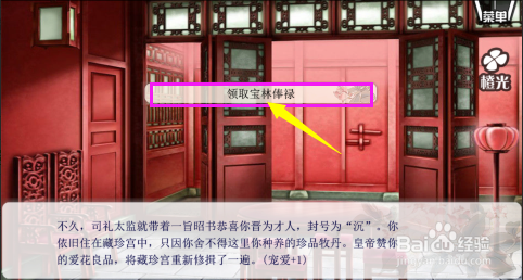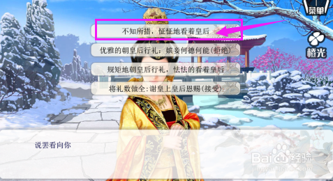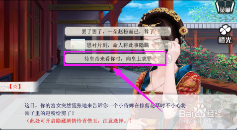 选择【不知所措,怔怔地看着皇后】。如许可以获得皇帝的救援。其他三个有个选了直接进入灭亡,具体哪个健忘了!印象成果最好的就是选第一个~经由过程后就可以直接领取宝林俸禄,然后进级~