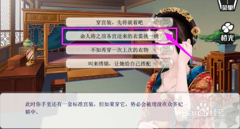 选择【命人将之前各宫送来的衣裳挑一挑】。这里灸和就派上用场了。当然,前面选择其他宫女的就不克不及选这个啦~