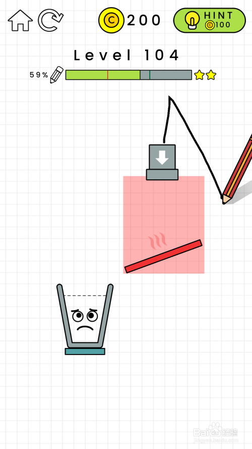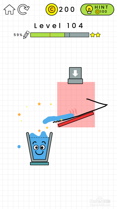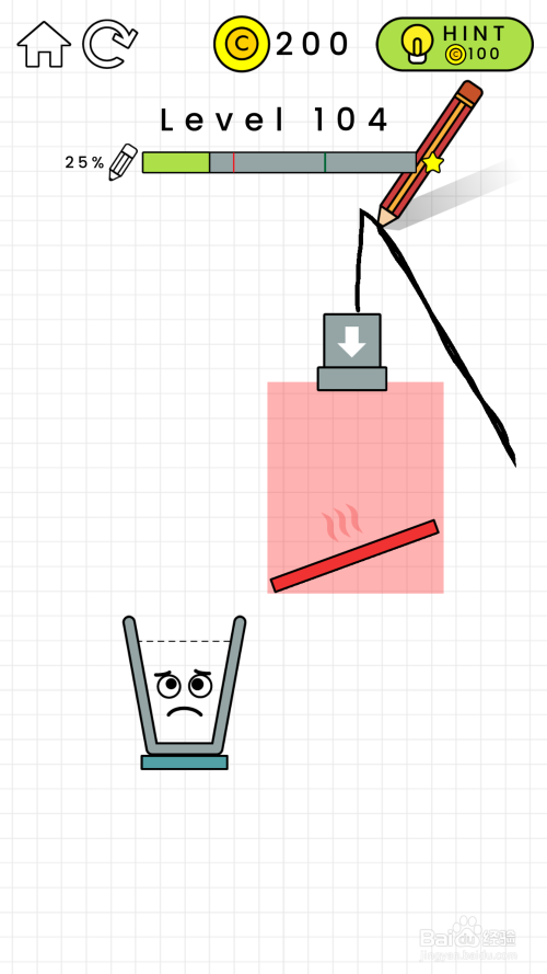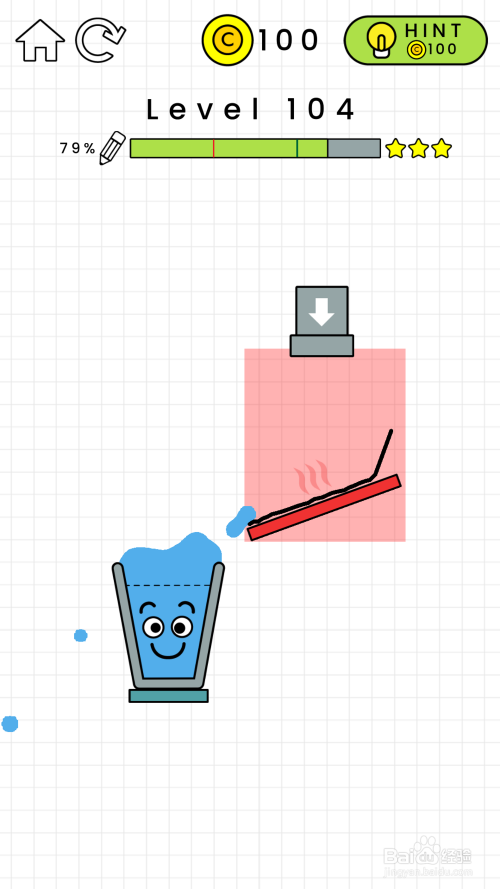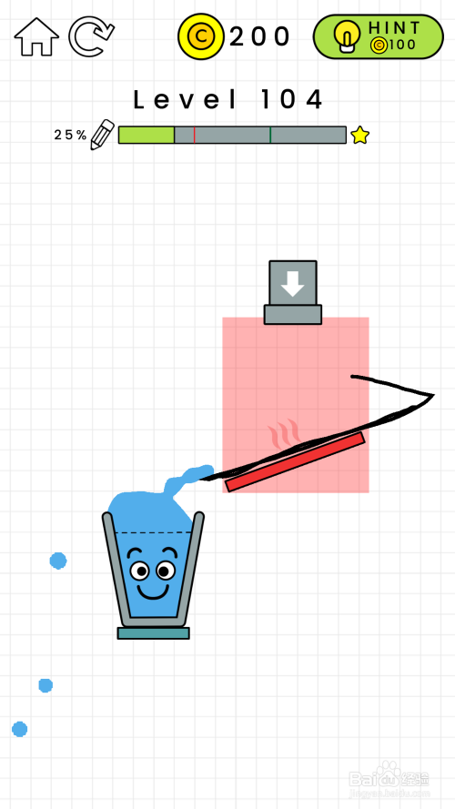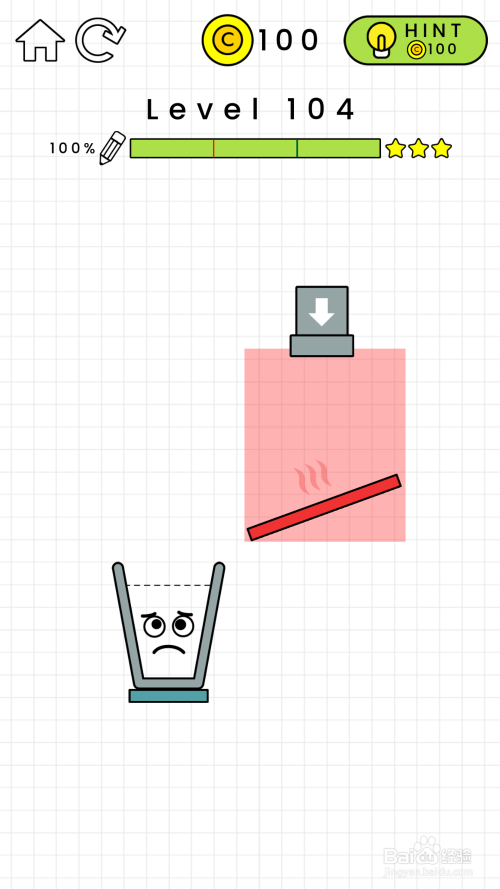 104关卡阐发:在104关卡中,我们看见有一块红色区域不克不及进行绘制曲线,然后还有一个发烫的红木板。什么都不画的话,水失落在发红的木板的吧水蒸发失落。要想经由过程关卡的话,就必需使玻璃杯的水装满才行。如图所示。