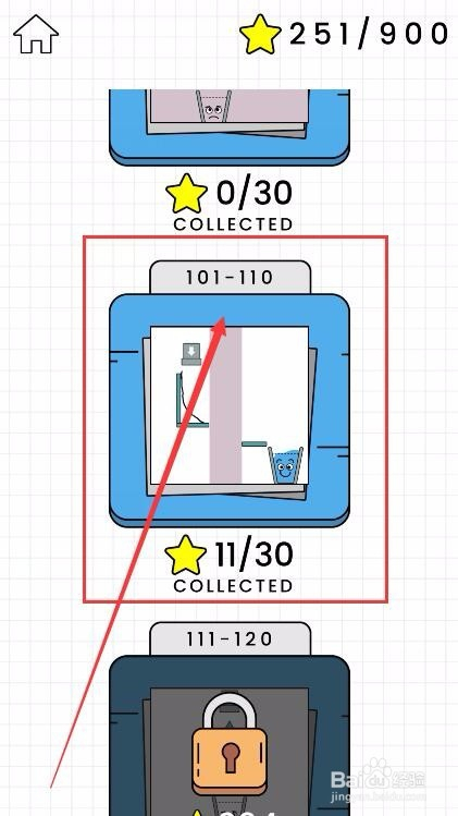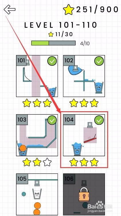 然后滑动屏幕,在关卡本家儿界面中找到104关卡,点击进入响应的关卡,如图所示。