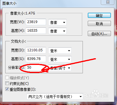 点击【图像】-【图像大小】,弹出【图像大小】对话框。将对话框里的【分辩率】调低,点击【确定】。此时文件占内存量将年夜年夜削减;