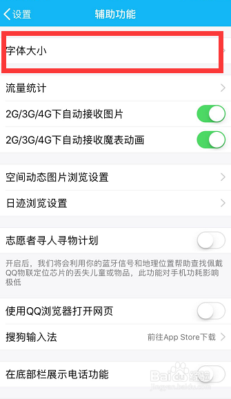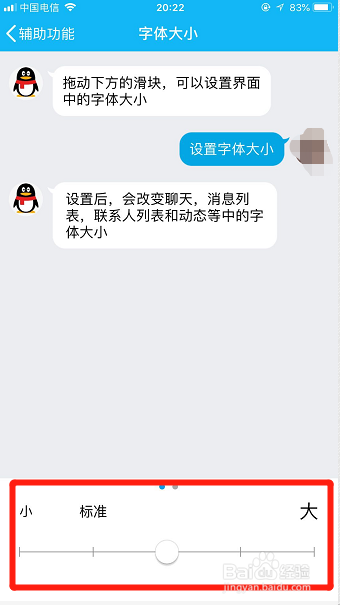 点击辅助功能后,进入辅助功能本家儿页。在辅助功能本家儿页的第一行就是【字体大小】,点击进入进行对聊天字体大小的设置!