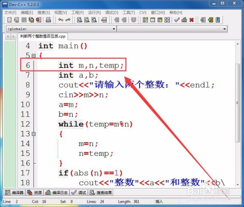首先,界说三个整型变量,保留输入的整数m和n,以及余数。