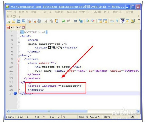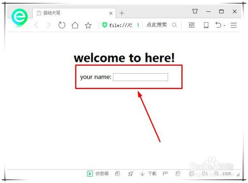 保留点窜后,在浏览器打开网页,输入内容,当文本框掉去核心时,里面的内容就会主动转换当作年夜写了!