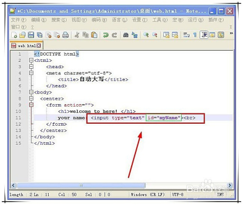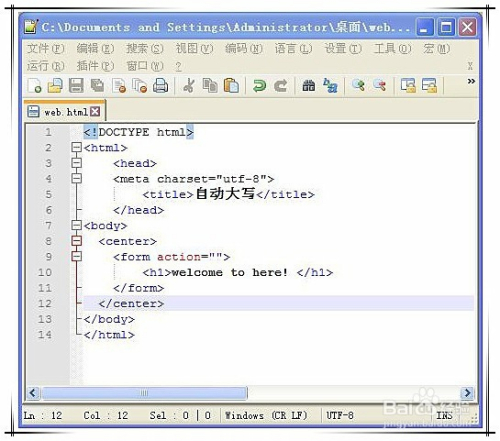 为便利讲解示范,编写如下图所示的一个web.html网页文件:题目为“主动年夜写”,网页只包含一个form标签和一个h1标签。