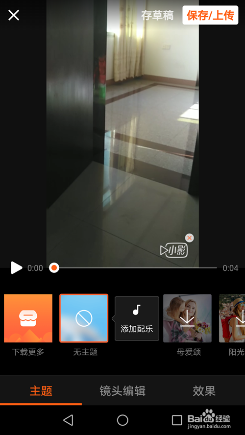 视频录制好后,点击添加配乐,选择合适的音乐插入后,然后保留上传。