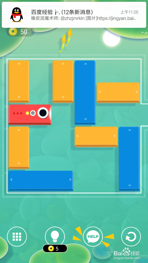 再将最后面(左)的黄色短形块标的目的下移动,让红色鱼块直接移动到最后(最左)端。