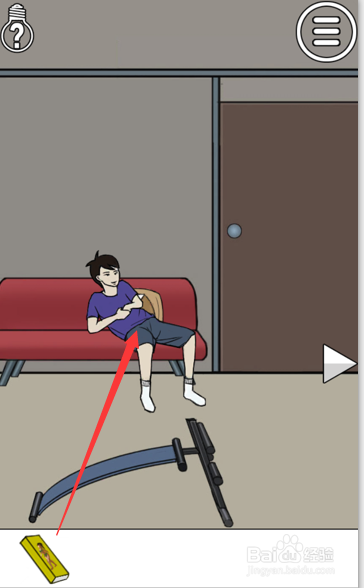 回到第一个画面,点击健身椅,男本家儿角会到健身椅上健身,这个时辰我们要快速把剪刀拖动到枕头处,剪开枕头里面有一本小黄书,拿到小黄书。当男本家儿角健身完毕后会原位置回到沙发上,我们把小黄书拖动给男本家儿角。