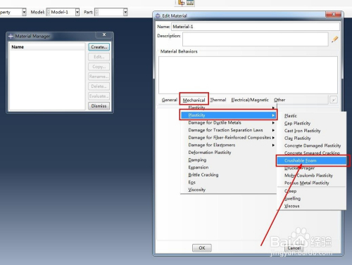 点击界面左侧的【material edit】图标,如图所示,并在弹出的面板上选择【mechanic】-【plasticity】-【crushable foam】,这个crushable foam就是可压碎泡沫