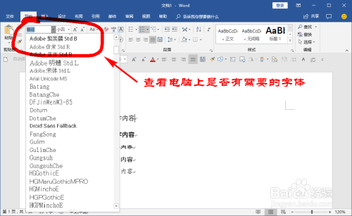 打开我们的word文档,查看文档中当前利用的字体是不是我们想要的字体,若是不是看看电脑上的字体里是否有我们想要的字体。