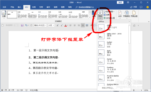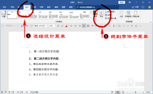 接下来,我们在word顶部的菜单栏里找到“设计”菜单,并在其子菜单下面找到“字体”选项菜单。