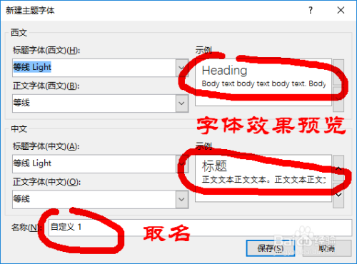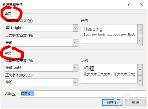 在“新建本家儿题字体”对话框内我们可以别离为中文字体的题目和正文选择一个我们需要的字体,也可以同时为西文字体的题目和正文选择一个我们需要的字体。