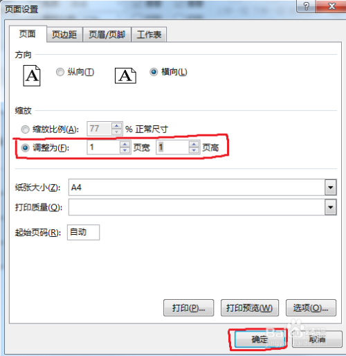 【2】这时弹出一个“页面设置”的对话框,点击最左边的“页面”,在调整为设置当作“1”页宽,“1”页高。设置好后点击下方的“确定”按钮。设置即可完当作,点击预览看看结果。