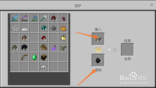 之后我们点击熔炉,将金矿石变为金块,鄙人方输入燃料,然后在上方输入金矿石,最后输出的就是金块儿,如下图所示。