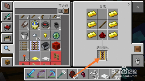 首先我们进入我的世界,我们点击工作台,然后搜刮动力铁轨,我们可以发现动力铁轨由木棍,金块和红石建造而当作,如下图所示。