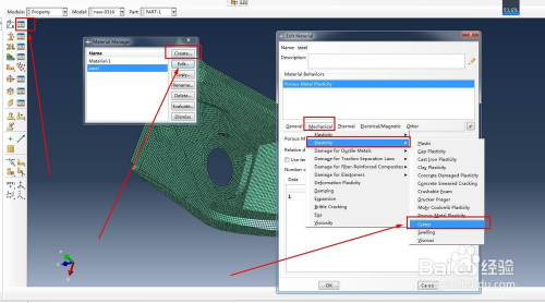 点击界面左侧的【material edit】图标,如图所示,并在弹出的面板上选择【mechanic】-【plasticity】-【Creep】